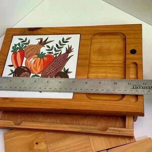 Vintage Goodwood wood Vegetable and Cheese board with tile insert. Featuring that classic 70s / 80s earthy veggie image and a slide-out board containing 6 drink coasters. This piece is in excellent preowned condition with no chips, cracks or damage. This is ready to use at your next get-together!
