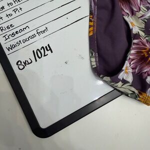 Embrace tropical vibes with this stunning two-piece bikini set featuring a lush floral print in shades of purple, white, and gold. The top is designed with a flattering halter neck and a playful front-tie detail that adds a touch of feminine charm, while the matching bottoms offer a comfortable, classic fit. This set is in excellent pre-owned condition, showing no visible signs of wear and ready for your next adventure. Perfect for a tropical vacation, a relaxing pool day, or a beach getaway.