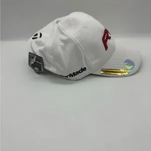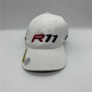 NWT. TaylorMade R11 golf hat is a white adjustable baseball cap featuring embroidered red and black "R11" branding.