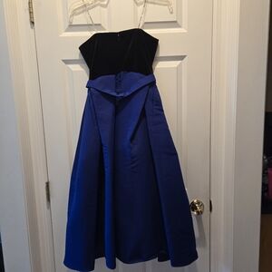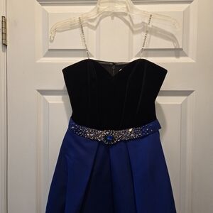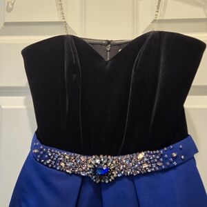 New with tags. Comes with a bead pack. Women’s 0. Approximate measurements: 14 1/2" pit to pit. 26" waist. 41" length (from the top of the bust). The Siobhan Gown brings together the perfect combination of timeless elegance and modern style. Made from velvet and faille and flared at tea-length, this chic gown features a strapless top and an embellished belt to cinch the waist for perfect fit. Black and cobalt blue color-way. Stretch Velvet. Zips down the back. Sticky stuff to keep dress up.