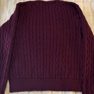 Elegant women's 100% cotton V-neck sweater by Polo Ralph Lauren. Deep burgundy hue. Classic cable knit design and embroidered Polo pony logo on left chest, slim fit with ribbed cuffs and hem. Sizing seems like a large. Wonderful condition like new! Measurements laid flat: