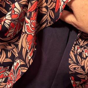 Elegant floral blouse with a V-neck. Features long sleeves. Ideal for any occasion. Colors are navy and red.