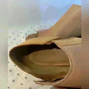 Rich tan upper with slight contrasting detail on side. Very cute shoes with loads of classy vibe and chic looks. Leather. Comfortable, lug sole styling. Nice height and peep tie. Side zip with elastic gore.