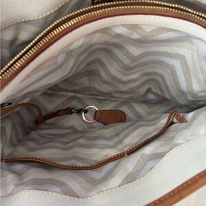 Chic Dooney & Bourke tote with off white and brown leather. Perfect for versatile style. Elegant and functional. this bag is large with plenty of compartments and pockets. Top handle or adjustable shoulder strap. In wonderful condition. There is a minor mark on the bottom back see photos. Measurements also in the photos the shoulder strap is 8” from the top.