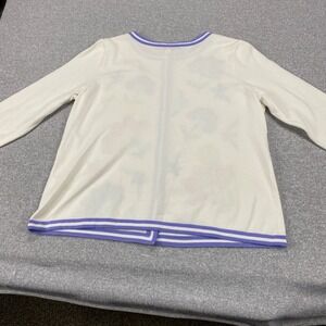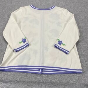 Sigrid Olsen cardigan sweater features a charming floral embroidery design in shades of blue, purple, and pink against a crisp white background. Crafted from a soft cotton and nylon blend, this button-front piece includes sporty striped trim along the neckline, cuffs, and hem for a refined touch. The 3/4 length sleeves also showcase delicate floral accents, making it a versatile layer for transitional seasons.