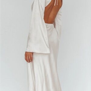 Elegant cream dress with long sleeves. Features a fitted silhouette and cut-out details. Perfect for special occasions.