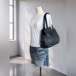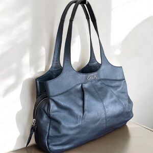 Stylish Coach Lexi in Navy Graphite pleated leather. Perfect for daily use. Features silver toned hardware, three interior compartments, with a snap and zip closure. Measures approximately 15”w x 10”h x 4”d with a 9” strap drop
