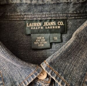 1X Womans Classic blue denim shirt by Ralph LaurenJeans Co. Features button-up front and collar. Ideal for casual outings.