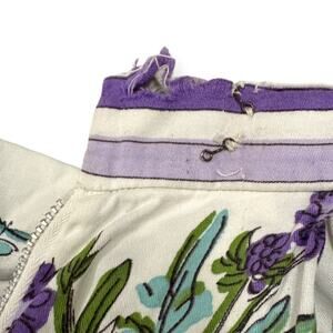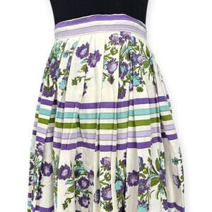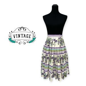 VINTAGE | Size 2 | Cream Purple and Green Floral + Stripe Print Pleated Skirt