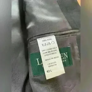 Lauren Ralph Lauren men’s dark gray single breasted sport jacket/blazer, size 42L. 4 button sleeve design. 100% Wool. Multiple inner pockets. EUC. No rips, holes, stains or odors. Please see photos for item details/dimensions. Some photos may appear different in color due to lighting. Ships from smoke-free home.