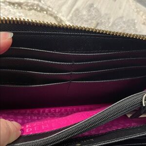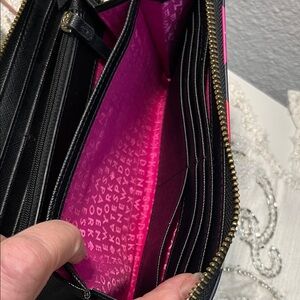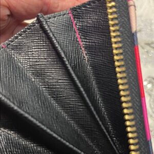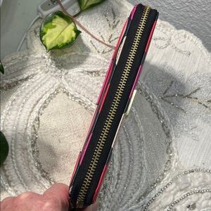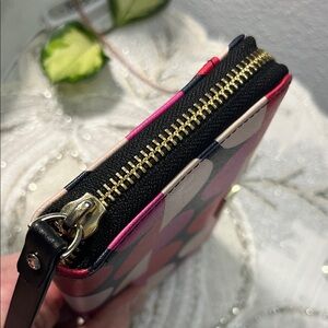 Chic wallet with bold circle design. Features pink, red, and cream accents. Ideal for a stylish touch. Zip around closure - includes 12 credit card slots, multiple bill compartments, and a central zippered coin pocket. Gold logo name plate does show some wear