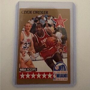 Clyde Drexler NBA Hoops trading card from All-Star Weekend 1990. Features a gold border and vibrant design. Bundle & save 20%!
