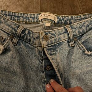 Item Description: Abercrombie & Fitch jeans, size 31/12, distressed light wash, high rise, style: The Dad, part of the curve love collection, button fly, front & back pockets, belt loops, stretchy.
