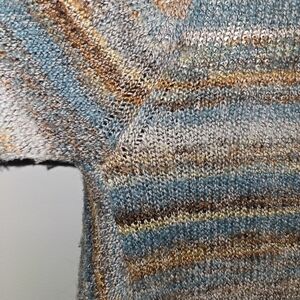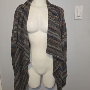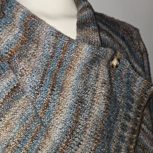 Embrace warmth and style with this cozy striped poncho. Featuring a blend of blue, brown, and gray tones, it's perfect for any casual outing.