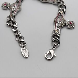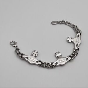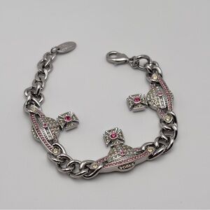 A stunning and collectible statement bracelet featuring Vivienne Westwood’s iconic Saturn Orb motif, adorned with shimmering crystals in silver-tone hardware. Designed with a bold chain link style and secure lobster clasp closure, this piece adds instant luxury to any look.