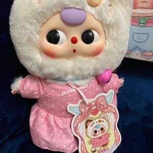 Adorable Baby Three Kitten is wearing a pink polka dot dress and has a little jingle bell attached to dress. Hands and feet move. This is perfect for collectors and kids. Comes with card, plastic bag and box