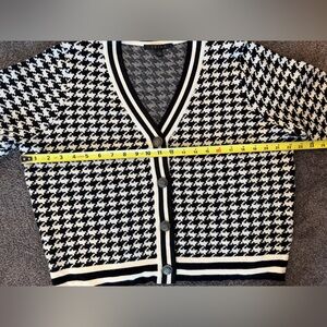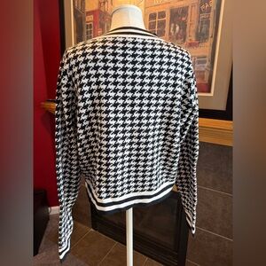 Stylish black and white houndstooth cardigan with v-neck and button down closure. Features a classic design with striped trim. Worn just a couple of times, in excellent condition. Size large