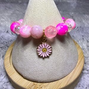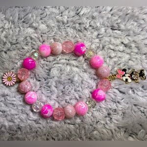 Charming bracelet with pink beads and a playful character charm. Adds fun to any outfit.