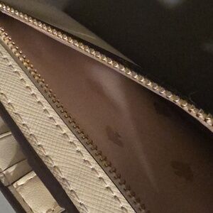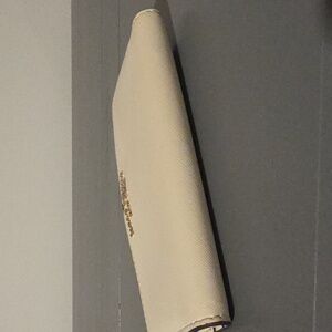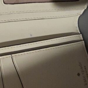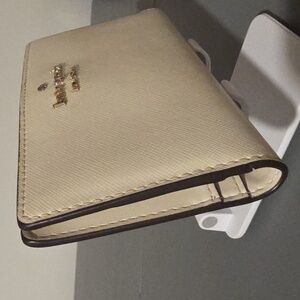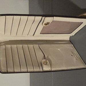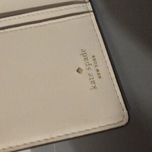 Elegant cream wallet by Kate Spade. Features a sleek bifold design with gold tone hardware. It doesnt have rips, one mark inside as shown, and in excellent pre-owned condition.