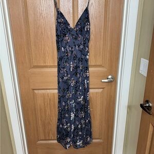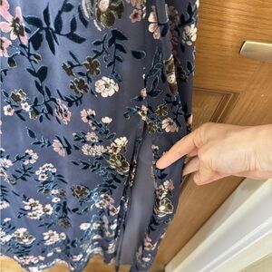 Luxe velvet, with a burnout floral design throughout. Triangle bodice, v-neckline, and adjustable spaghetti straps. High, empire waist and midi length with side slit. Fitted through waist and hip with no stretch in fabric. Fully lined. Hidden side zipper/clasp.