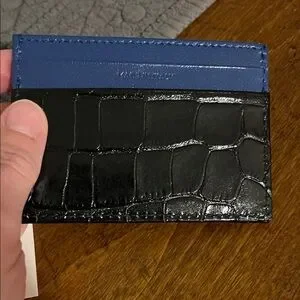Chic card holder by Clare V. Features black croc-embossed texture. Blue leather accent adds a pop of color. Ideal for organizing cards. 4 card slots and middle pocket for cash or more cards. New. I purchased to go with a Croco print Clare V. bag but decided to use my LV key pouch instead. Lovely item. Retail is currently $145 plus tax. Get it here for a bit less! Comes with original tag. Will wrap in tissue paper. It did not come with a box or dustbag. Bundle for a discount!