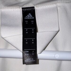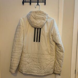 White quilted jacket with hood. Features zippered pockets and Terrex branding.