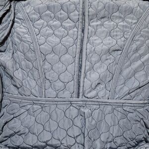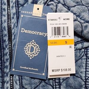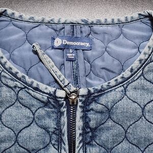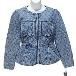 Women's Democracy Quilted Denim Jacket Puff Long Sleeve Zip Front Peplum Hem Color Washed Mid Blue Size S.
