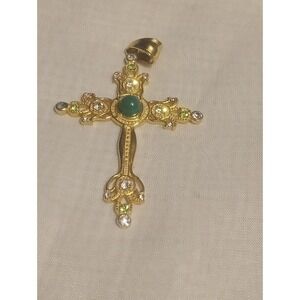 Vintage Gold Tone Cross Pendant w/ Green Cabochon Center & Clear Rhinestones...