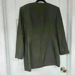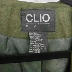This Clio suit in olive green is a timeless piece that will never go out of style. The jacket is long in length with a classic fit, and the skirt is a size 12 with a solid pattern. The set includes both the skirt and jacket, making it perfect for any formal, workwear, or business occasion.