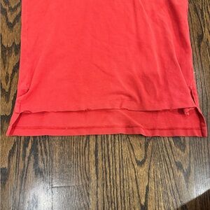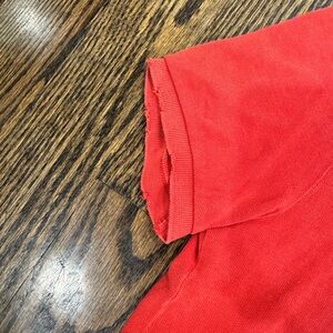 Vibrant red polo with classic collar. Iconic logo on chest. Ideal for casual wear. This is a custom fit Size M. The “wear” seen in photos is original wear and meant to look that way. This is a vintage polo