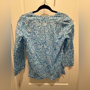 Lilly Pulitzer Amelia Chasing Tail Top. Blue Fish Cotton V-Neck 3/4. Small
