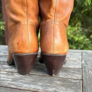 Vintage brown heeled boots by White Mountain, made in Brazil. They’re in great vintage condition and just need a good polish. Very comfortable compared to other cowboy boots as they have a rubber sole. Festival ready!