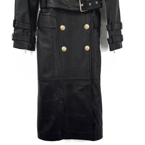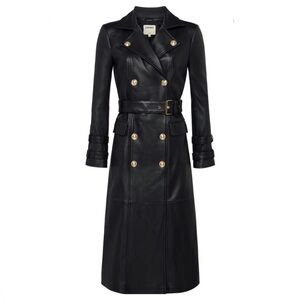 Crafted of supple leather, L'GENCE's Celina trench coat presents a military-inspired edgy flaunting a sharp notch collar and goldtone hardware. This double-breasted style features a cinching buckled belt and front welt pockets.