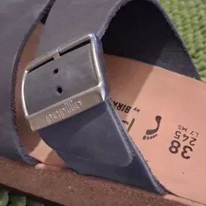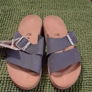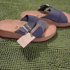 NWT Papillio Blue Slide Sandals with Silver Buckle, Suze 38, Narrow, Cork Wedges