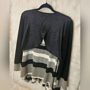 Make a statement with this rare and vintage-inspired knit cardigan from Artex! Its bold, horizontal grey and black stripes are perfectly complemented by a dramatic cape-style back, featuring a sumptuously smooth texture. The open-front design adds effortless sophistication, making this unique piece a true showstopper.