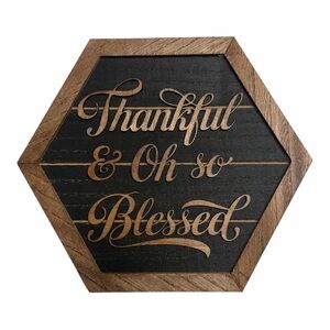 Stylish hexagonal wall sign with 'Thankful & Oh so Blessed' engraving. Perfect for home decor. Would need an easel or hardware for hanging.