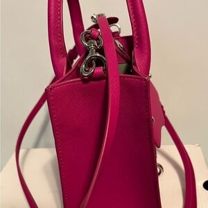 Vibrant fuchsia crossbody bag with silver hardware. Features top handles and adjustable strap. Stylish and versatile.