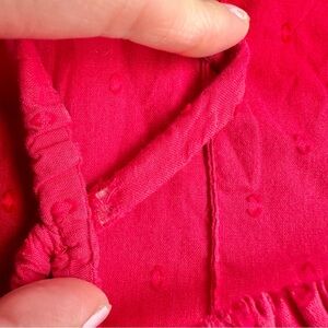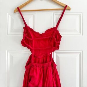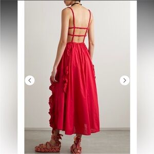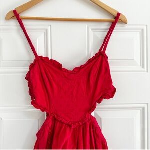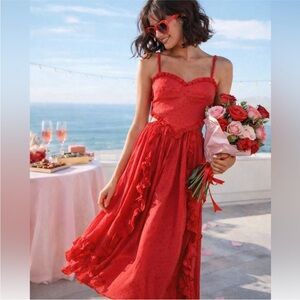 Has some light wear to the inside of the bodice and inside the straps. This stunning red dress features elegant ruffles and a flattering silhouette, perfect for any occasion. The vibrant color adds a touch of sophistication to your wardrobe.
