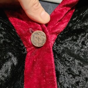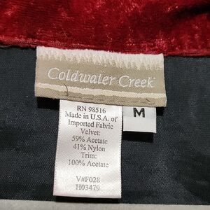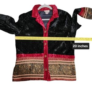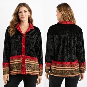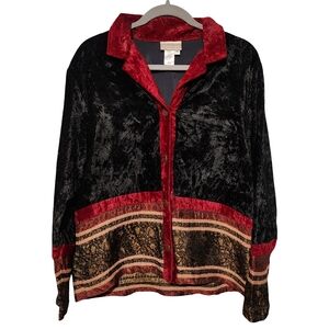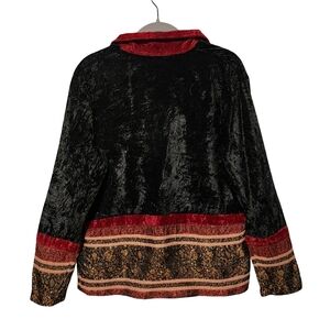 Pre-owned vintage COLDWATER CREEK womens velvet patchwork jacket in black and red. Size medium. Button front with textured patchwork detail along hem and cuffs.