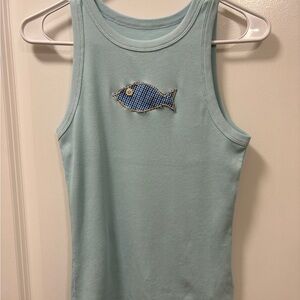 Upcycled light blue tank top with a playful blue fish motif. Perfect for spring and summer.