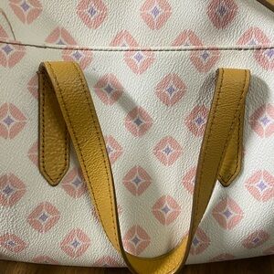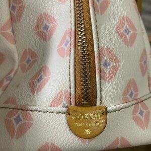 Elegant Fossil shoulder bag. Cream base with pink diamond patterns. Tan handles and strap. Perfect for any occasion.