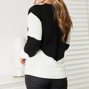Our two-tone rib-knit sweater is the perfect layering piece for any outfit. Its openwork design and classic round neckline add a feminine touch to this staple item, while its long sleeves and sturdy knit body keep you cozy no matter the season.