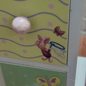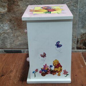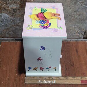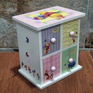 This is a Winnie the Pooh inspired small wooden four drawer chest, designed to function as a jewelry box or for storing small trinkets.
