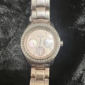Chic Fossil watch in silver with pinkish rose dial. Crystal-studded bezel. Multifunction dial with subdials.