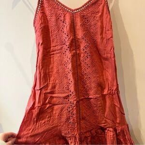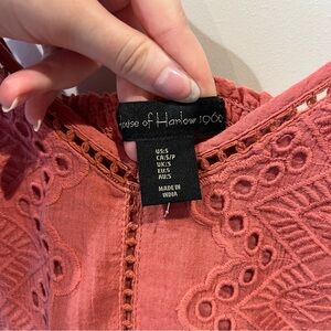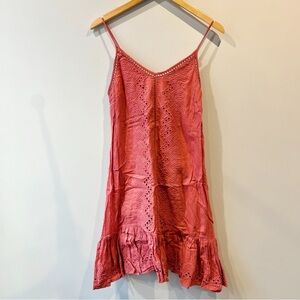 Boho chic deep salmon pink colored eyelet pattern mini dress with flounce hem from House of Harlow