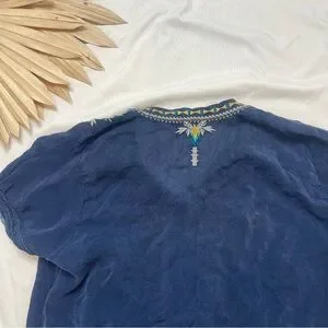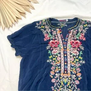 Johnny Was Raina Navy Blue Floral Embroidered Colorful Georgette Blouse Top PM