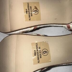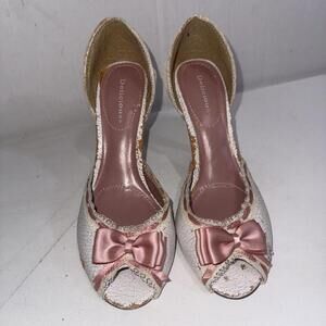 **FLAWED**Y2K Delicious White Pink Lace Bows Ribbon Trim Stripper Peep Toe Pumps Size 9, new without box but they are FLAWED!! As you can see in the photos, the white parts of shoe are flaking off.