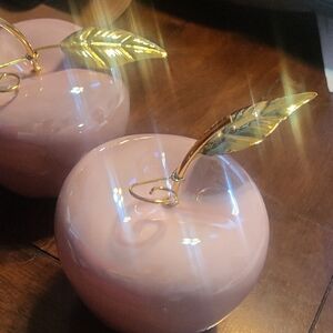 Add a touch of elegance to your home with this pink ceramic apple decor featuring a stunning gold leaf accent. Perfect for enhancing any room's aesthetic.