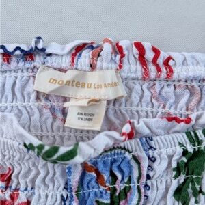 Monteau Los Angeles smocked crop top in a breathable rayon-linen blend — lightweight, airy, and perfect for warm weather. Features puff sleeves, a flattering square neckline, and a fully smocked bodice that stretches comfortably for a fitted silhouette.