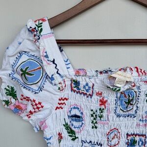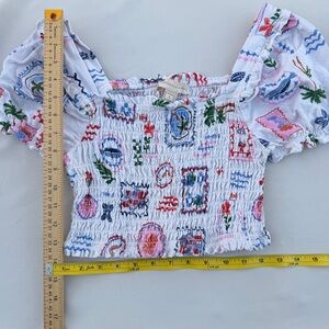 smocked crop top, puff sleeve top, Monteau top, cottagecore top, summer crop top, festival top, square neck top, linen blend top, patchwork print top, boho crop top, fitted crop top, spring top, romantic top, coastal style top, small crop top